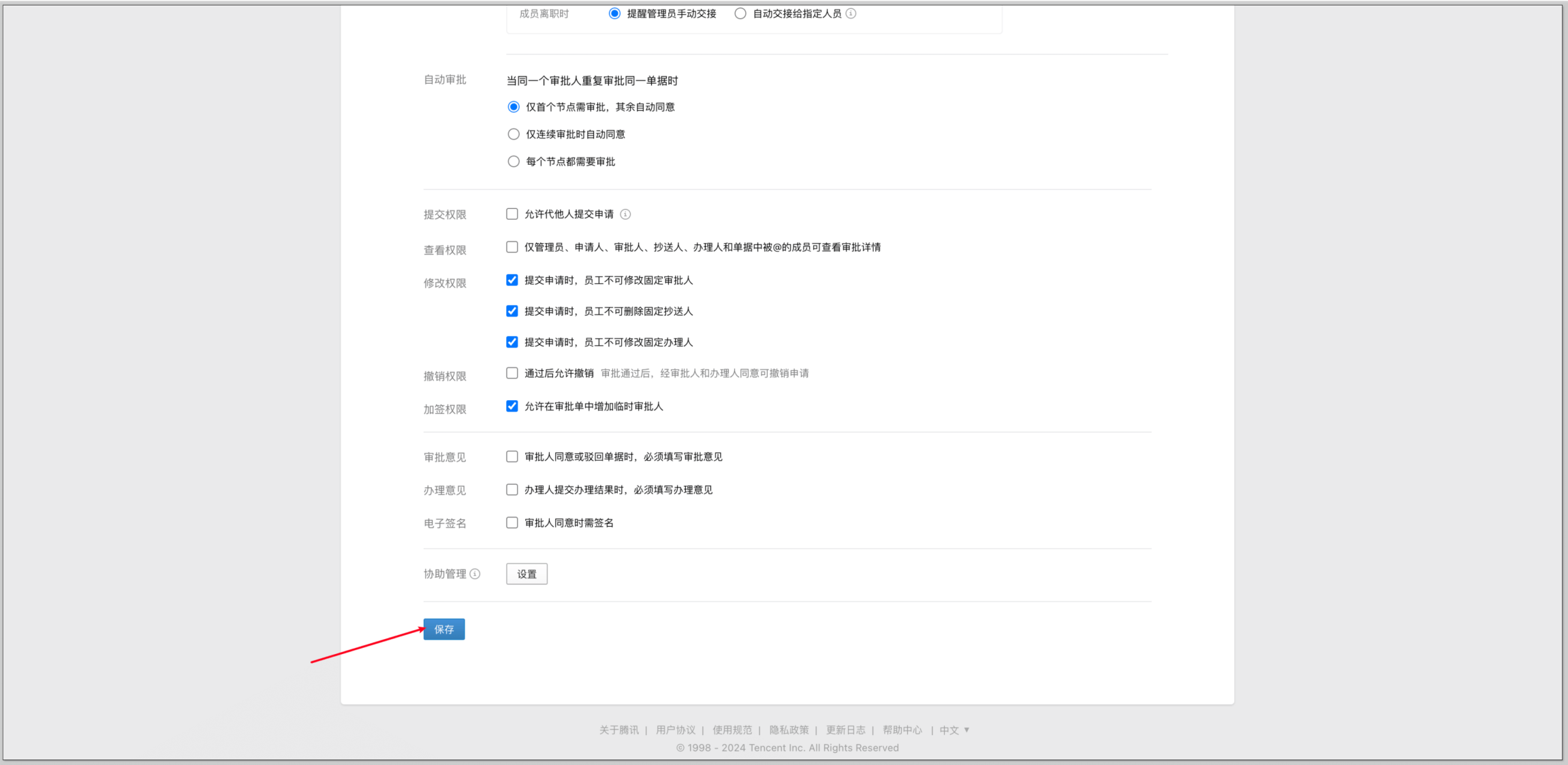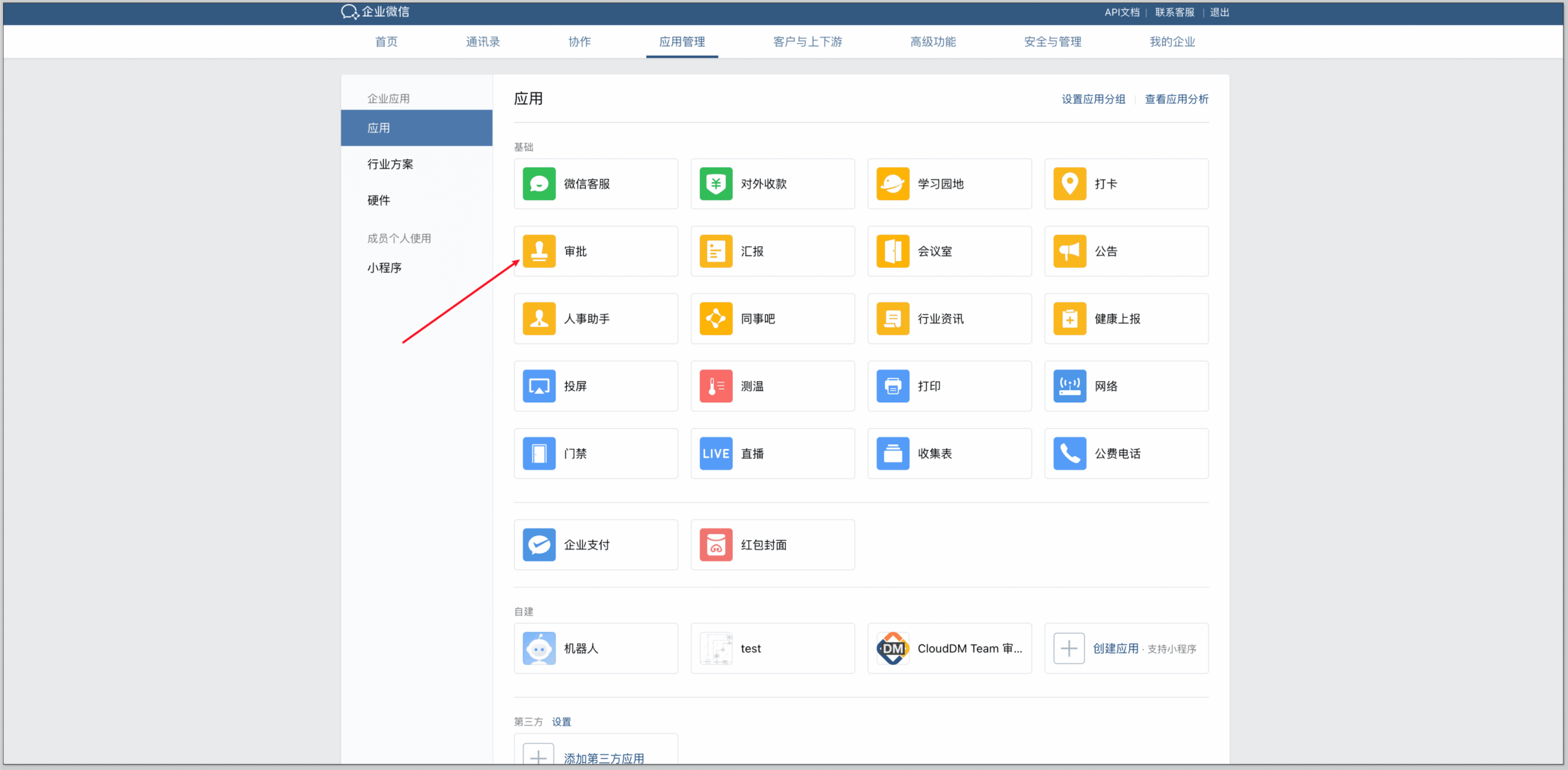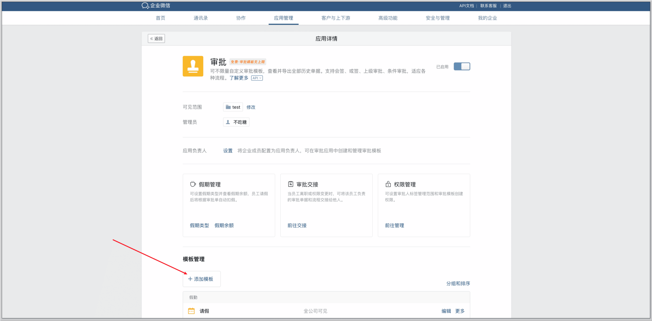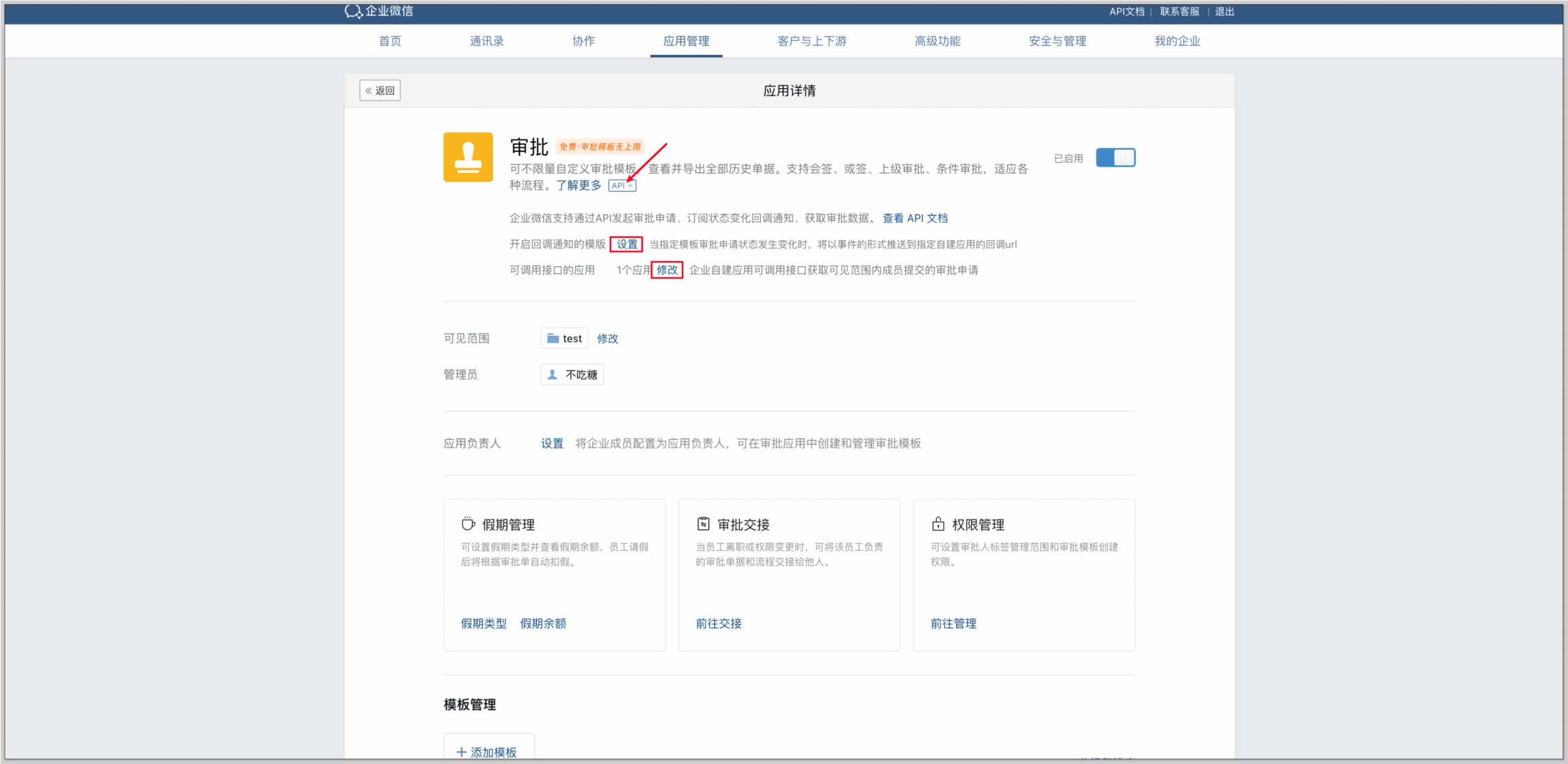 - 保存完成后,回到 审批 应用页面,开启模版回调通知和审批应用。