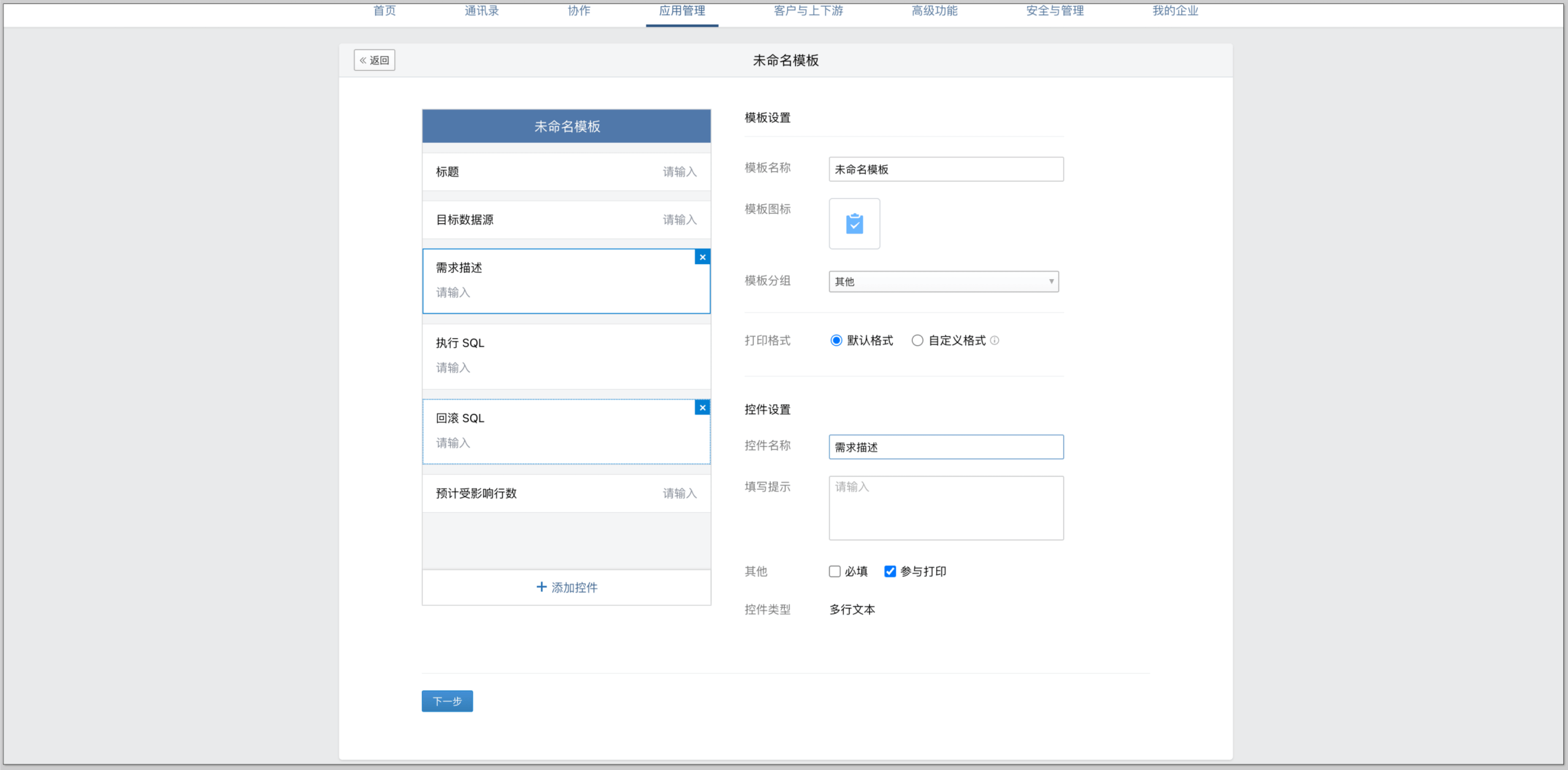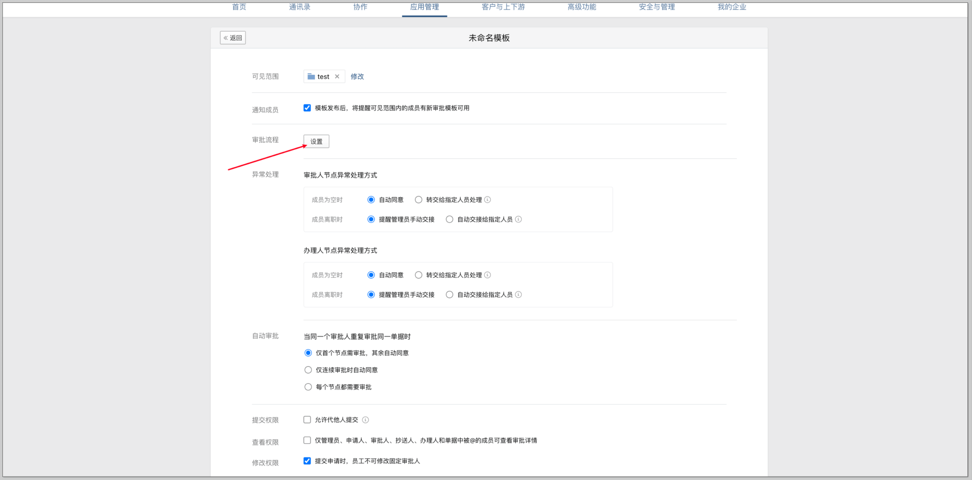 - 点击下一步后,设置 审批流程。根据需要设置审批流程,流程节点需使用指定审批人方式。