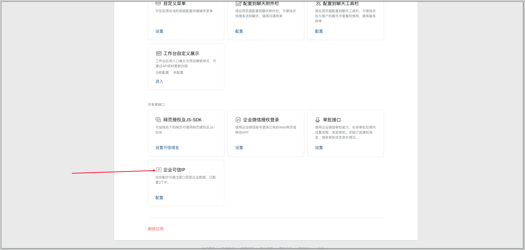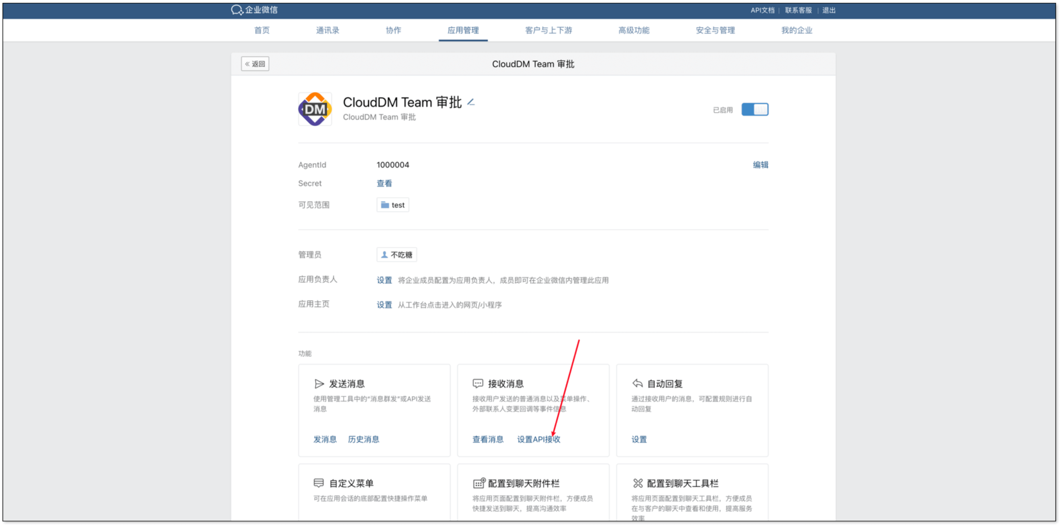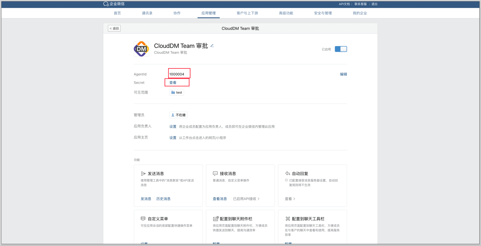 ,分隔),点击 保存。 - 在企业微信应用管理页面最下方,将部署 CloudDM Console 的服务器配置 企业可信IP。