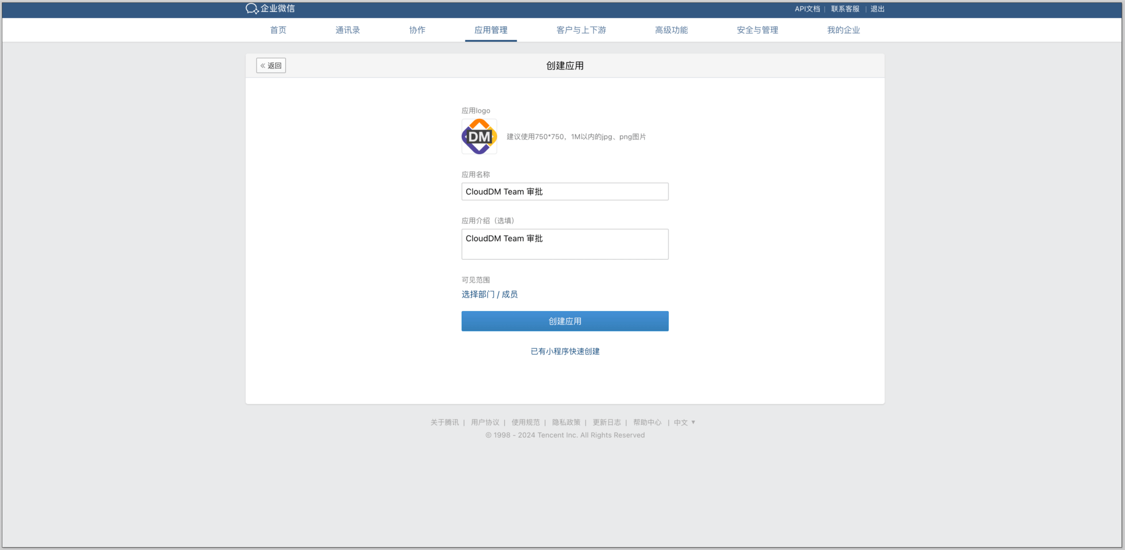 - 填写应用基础信息,并设置可见范围,点击 创建应用。