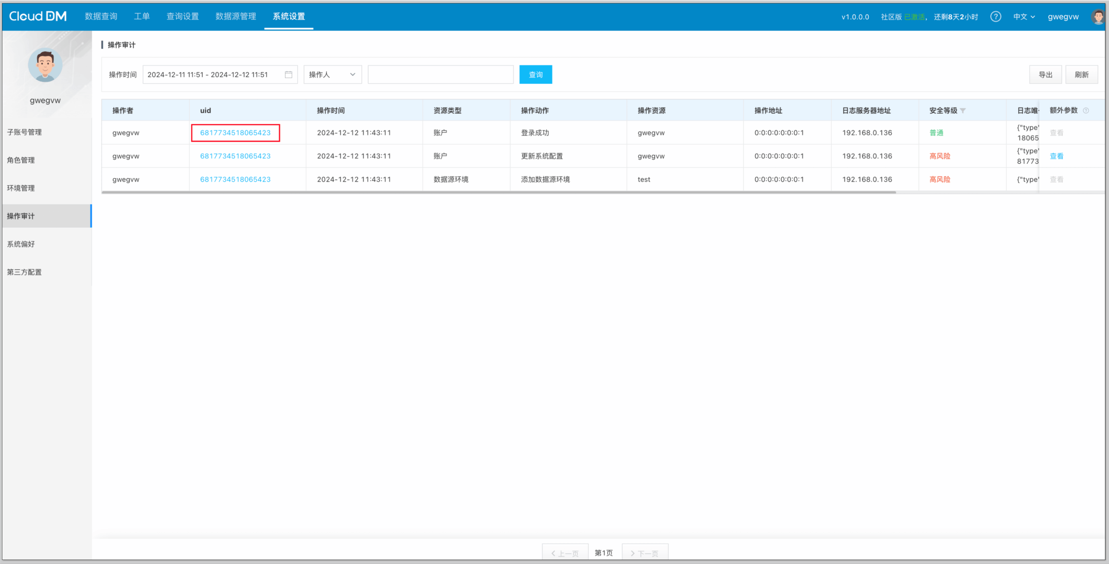 - 在 CloudDM 登入主账号。在 配置 > 操作审计 中找到主账号的 uid 并复制。