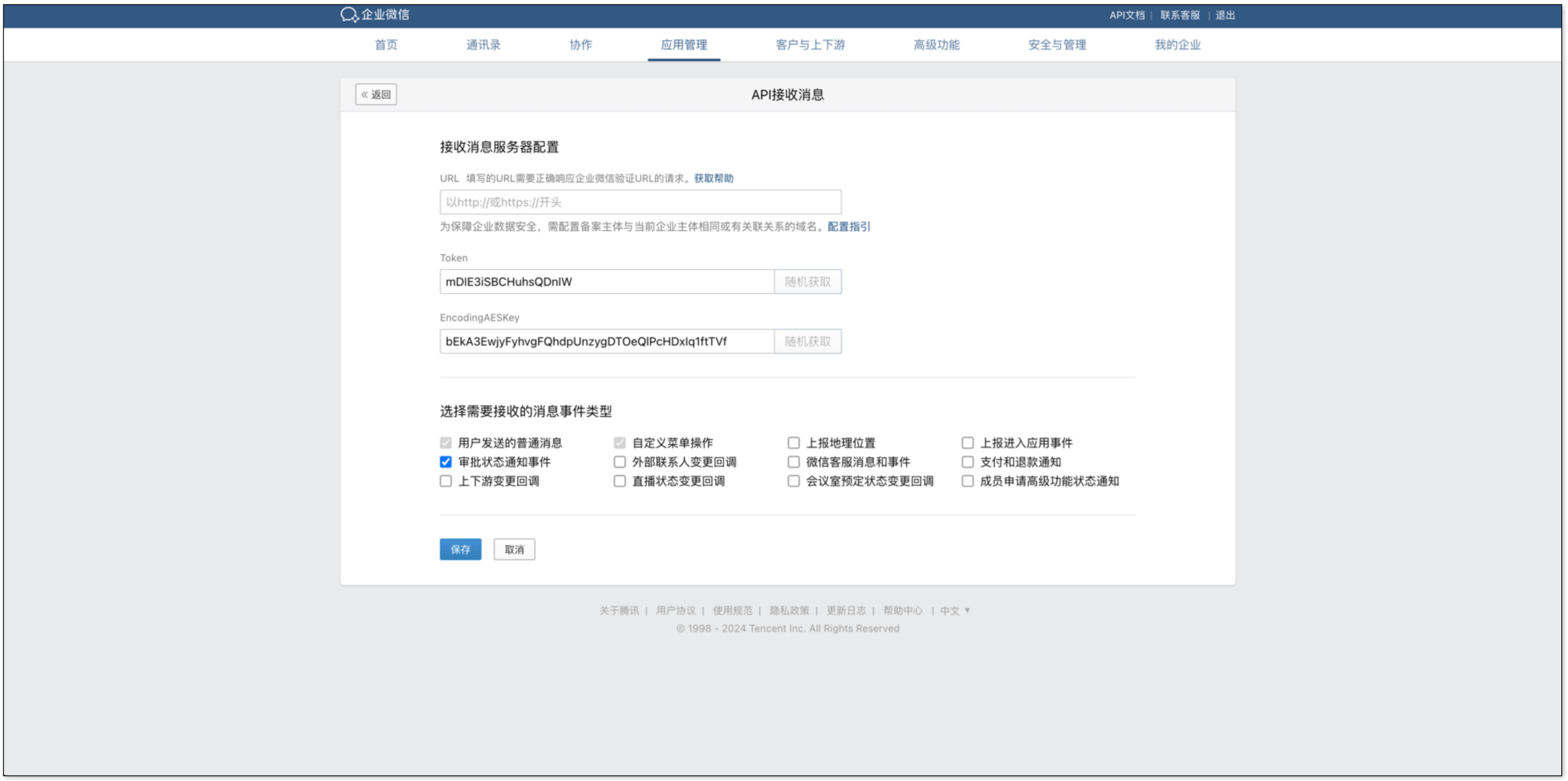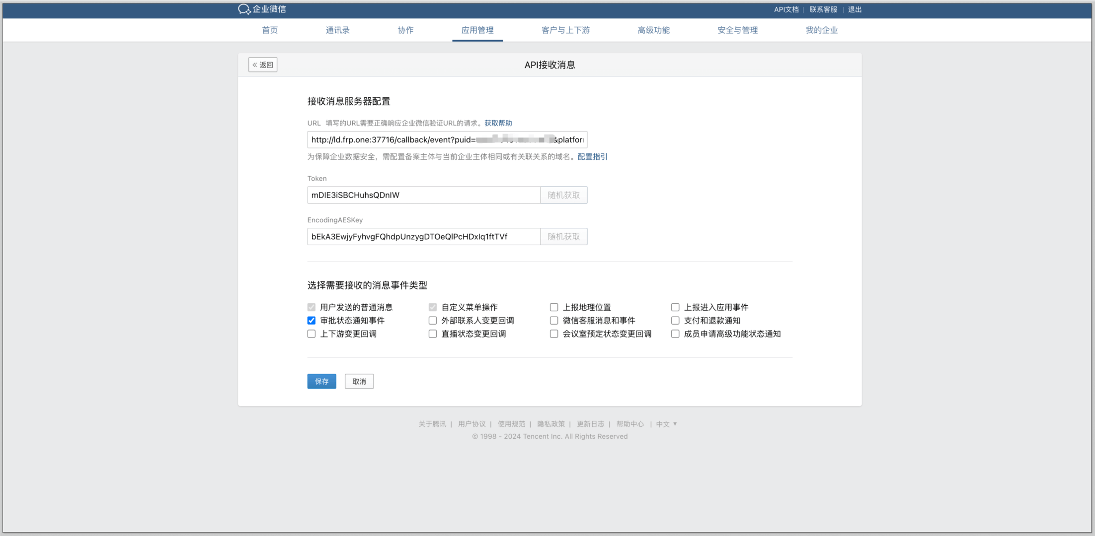 - 返回企业微信后台管理平台的 API 接收消息 页面,点击 保存。