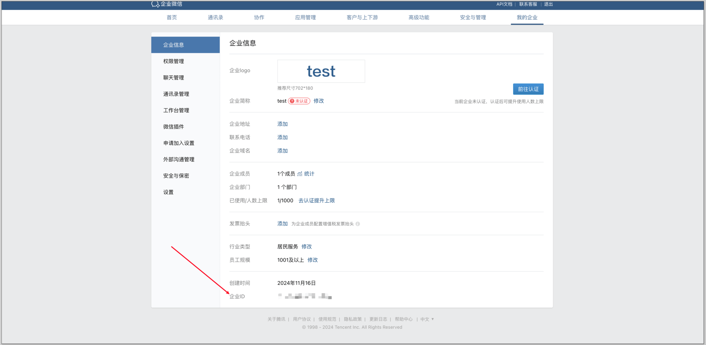- 在上方导航栏中点击 我的企业。获取 企业ID。