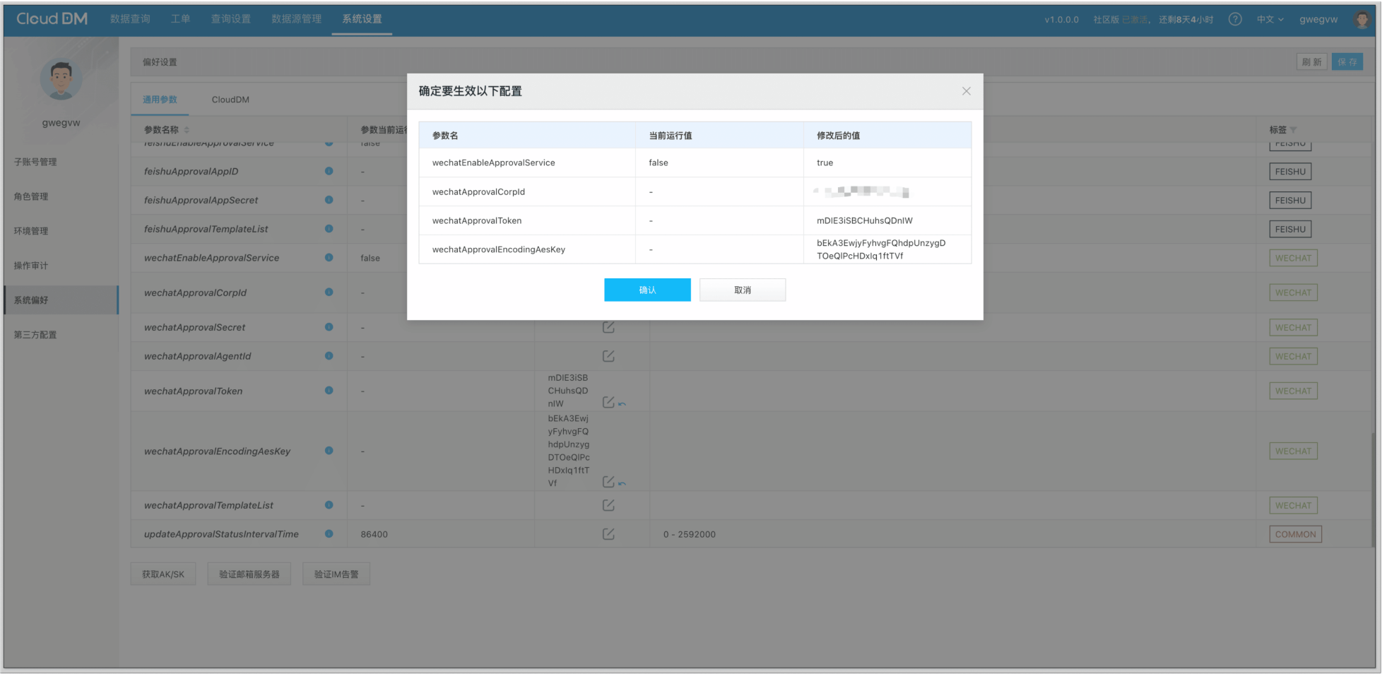 - 回到 CloudDM 界面。在 配置 > 个人偏好 中将之前获取的 Token 填入 wechatApprovalToken,EncodingAESKey 填入 EncodingAESKey,企业ID 填入 wechatApprovalCorpId,并开启 wechatEnableApprovalService。