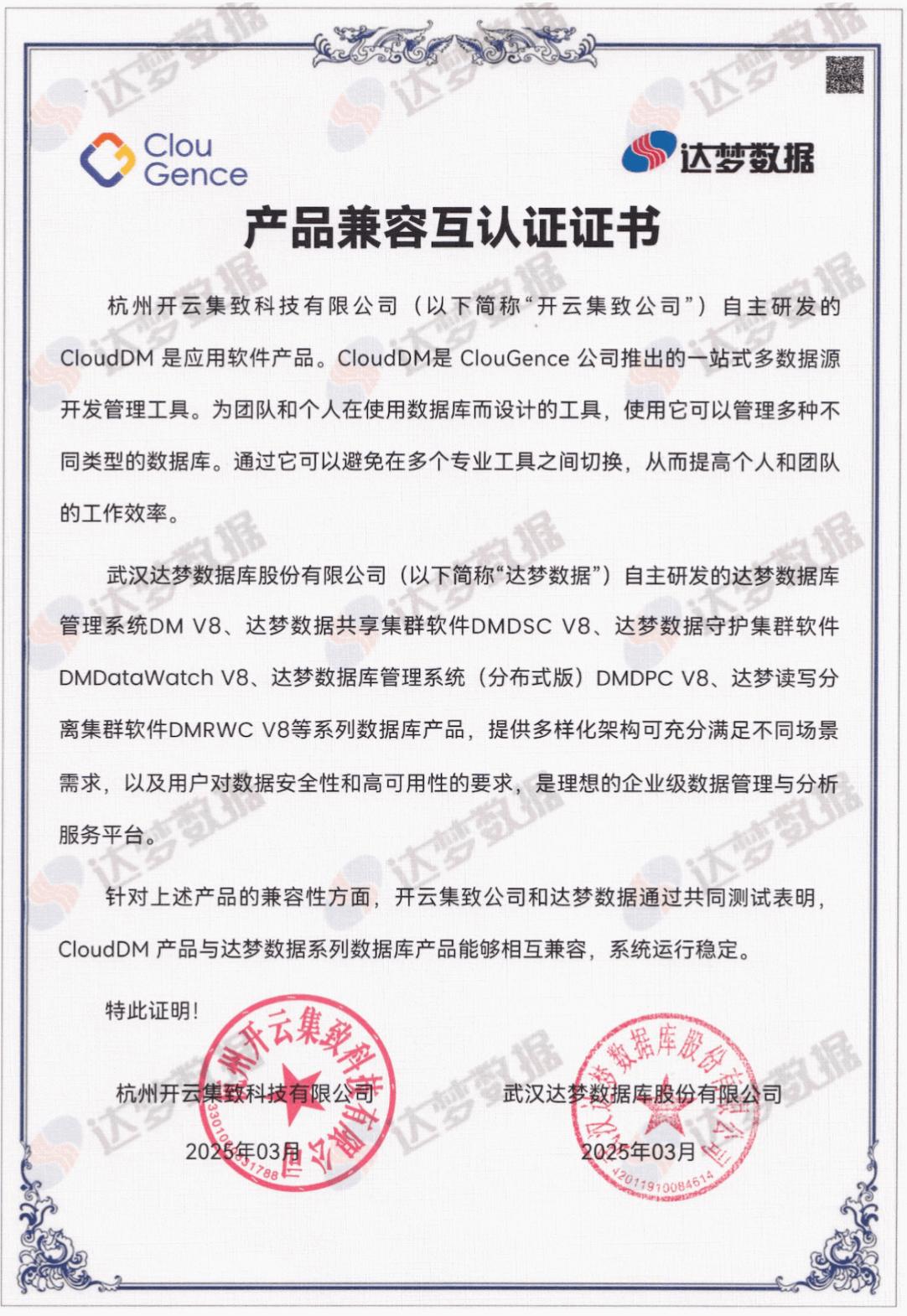 近日,杭州开云集致公司推出的一站式多数据源开发管理工具 CloudDM 与武汉达梦数据库股份有限公司自主研发的 达梦数据系列数据库产品 正式完成 产品兼容性互认证。