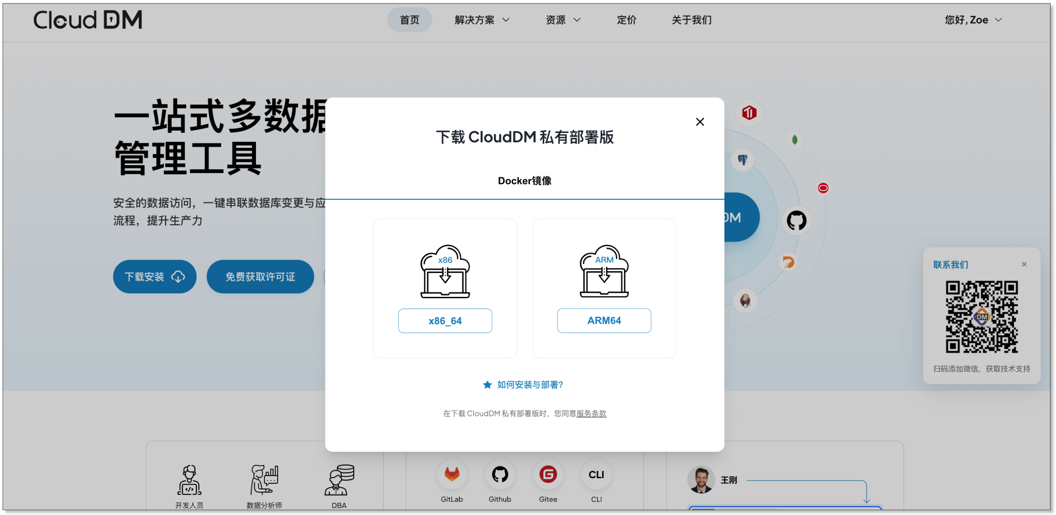 前往 产品官网 可下载 CloudDM 最新安装包,目前仅支持 Docker 版本。根据需要部署的服务器选择对应的版本。本文中以阿里云 ECS 为例,操作系统为 Ubuntu,硬件配置为 x86 架构,4 核 CPU,16 G 内存,120 GB 硬盘。