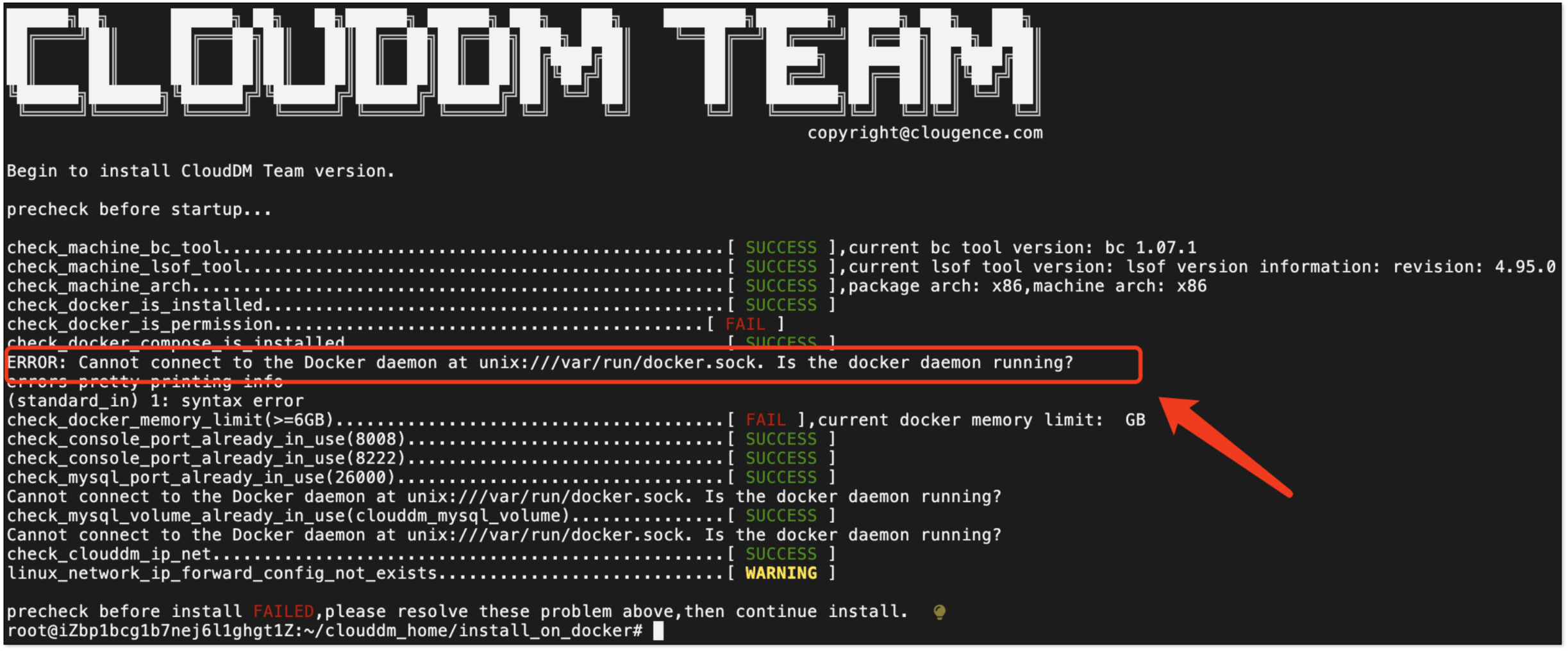 在安装过程中,如果遇到以下的报错信息,大概率是因为系统中 Docker 服务没有启动,请回看安装 Docker 环节。
