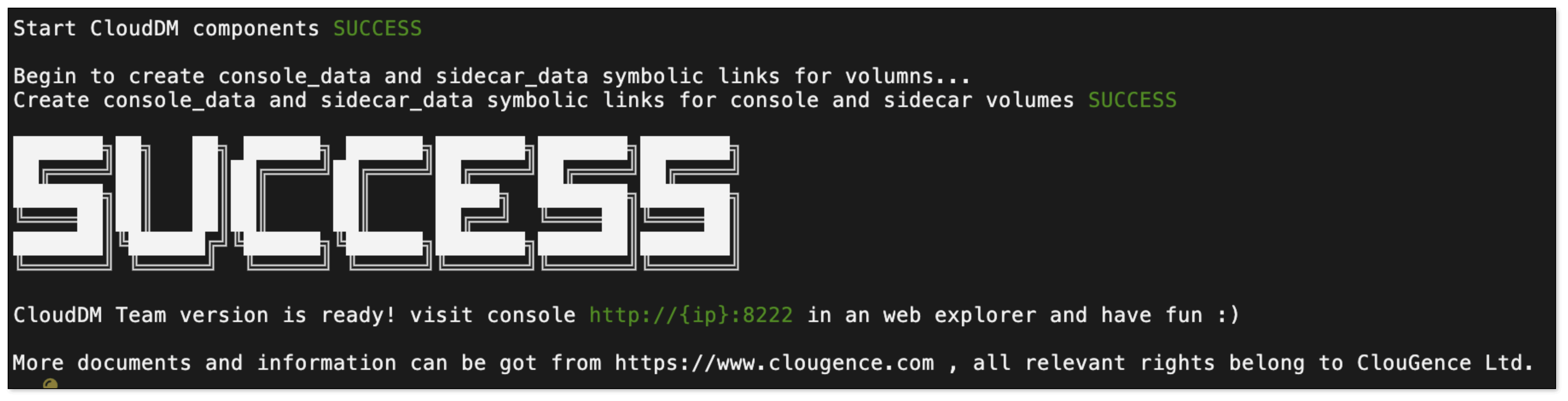 - 当你看到 “CloudDM Team version is ready! visit console http://