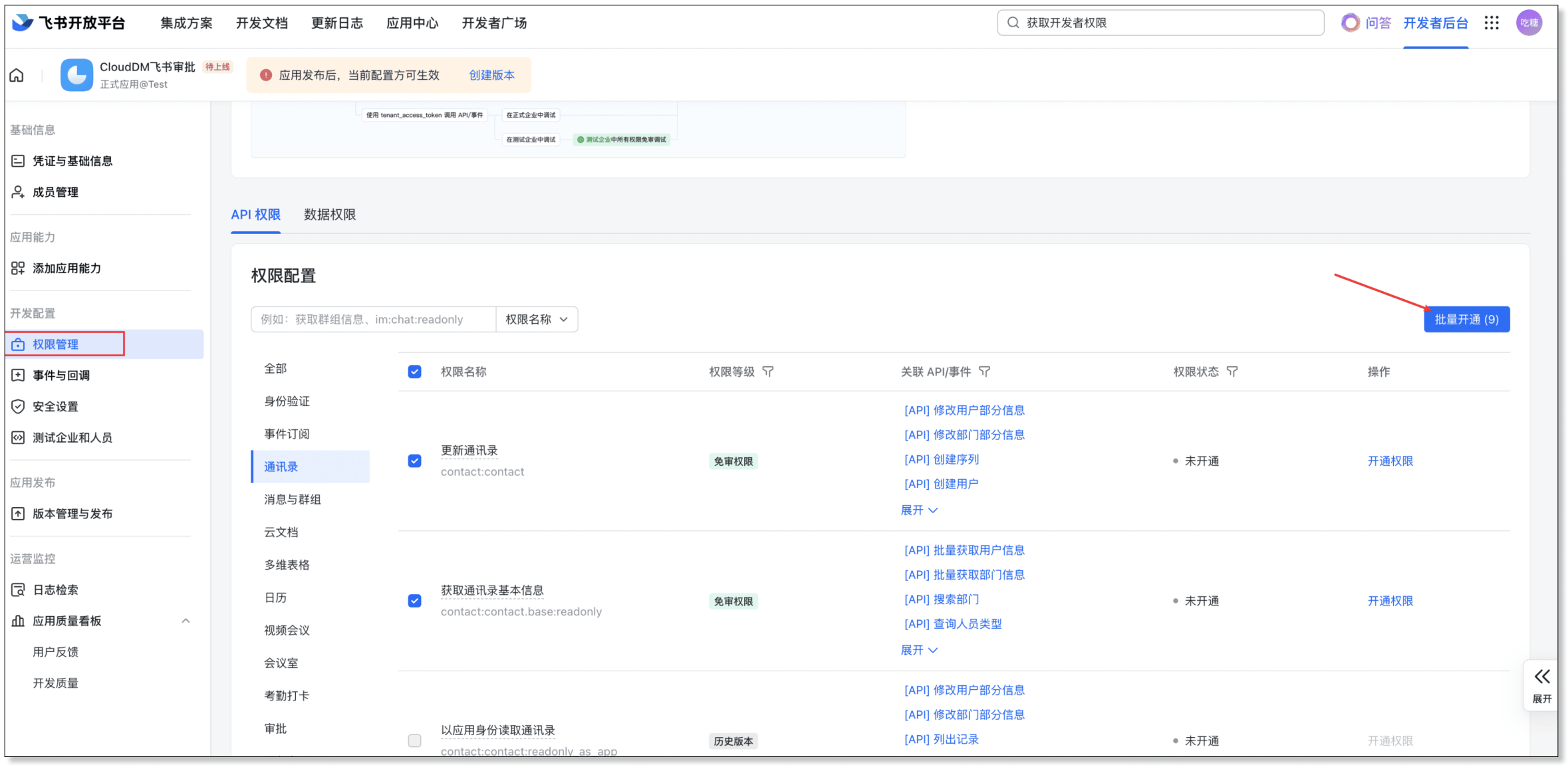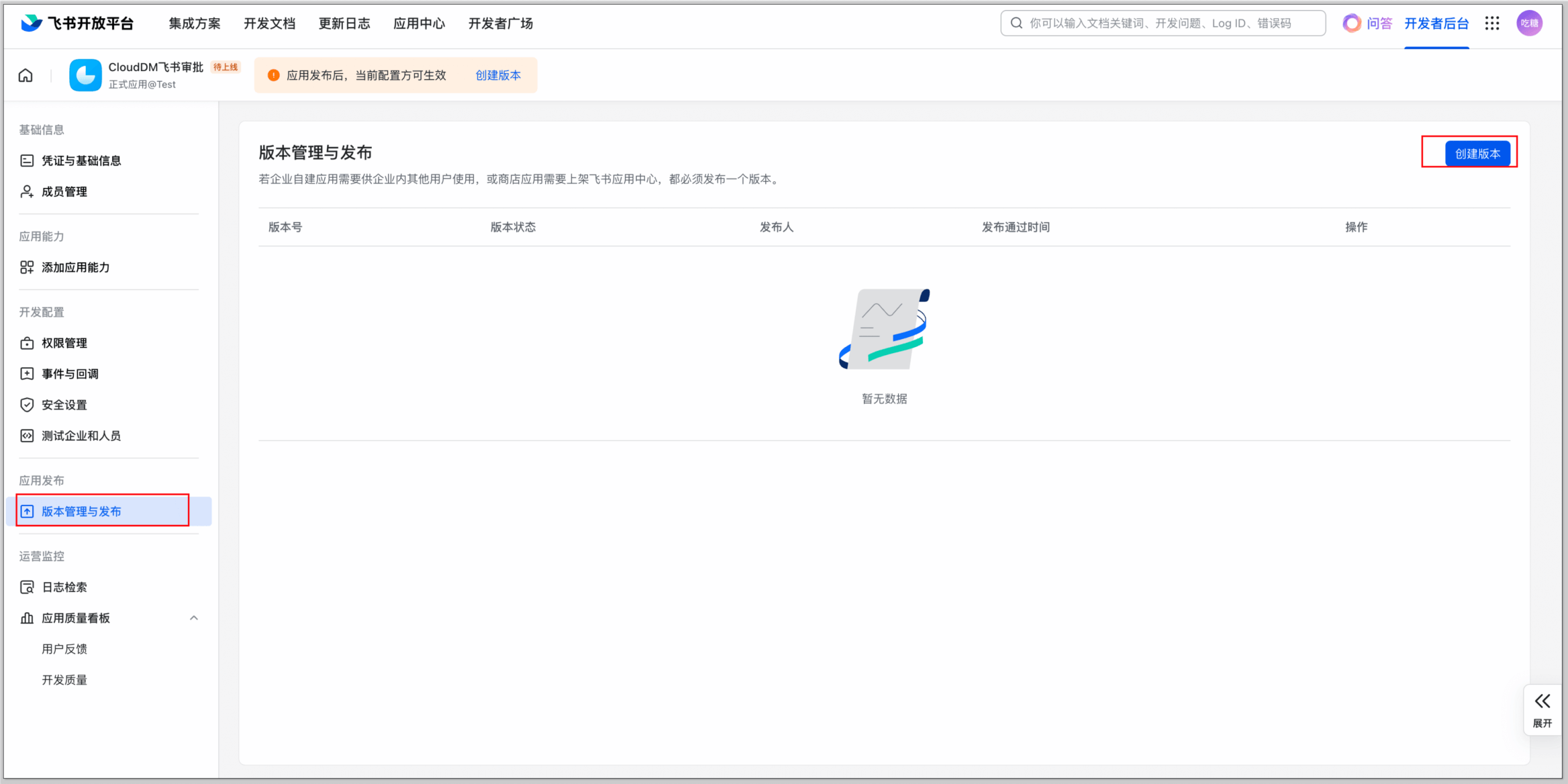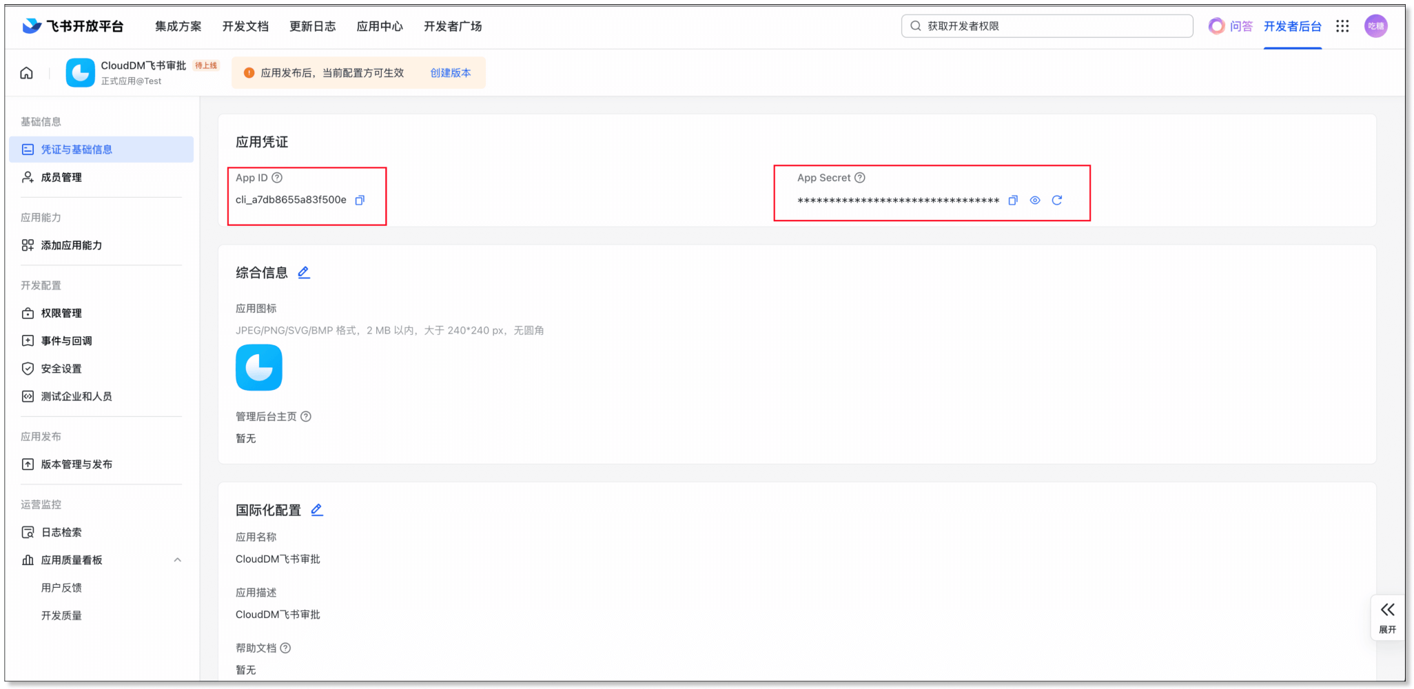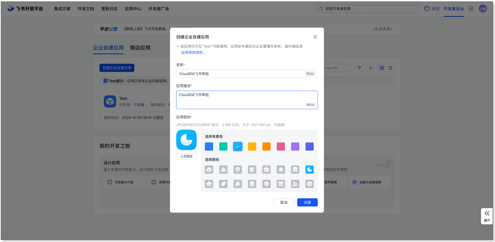 使用 CloudDM 和飞书流程化管理数据库变更审批April 16, 2025 · 4 min read刘琳玉CloudDM 是一个专为团队协同工作打造的数据库数据管控平台。在管控数据库安全变更的过程中,为提高效率,方便用户使用,CloudDM 接入了主流 OA 协同办公系统(包括钉钉、飞书、企业微信),支持实时通知与移动办公,满足广大企业用户的实际需求。 本文将介绍如何使用 CloudDM 和飞书实现高效的数据库变更审批。 接入飞书 创建飞书应用 登录 飞书开发者后台,选择相应的组织,进入后台页面。 点击 创建企业自建应用,填写应用基础信息,并点击 创建。 配置飞书应用
