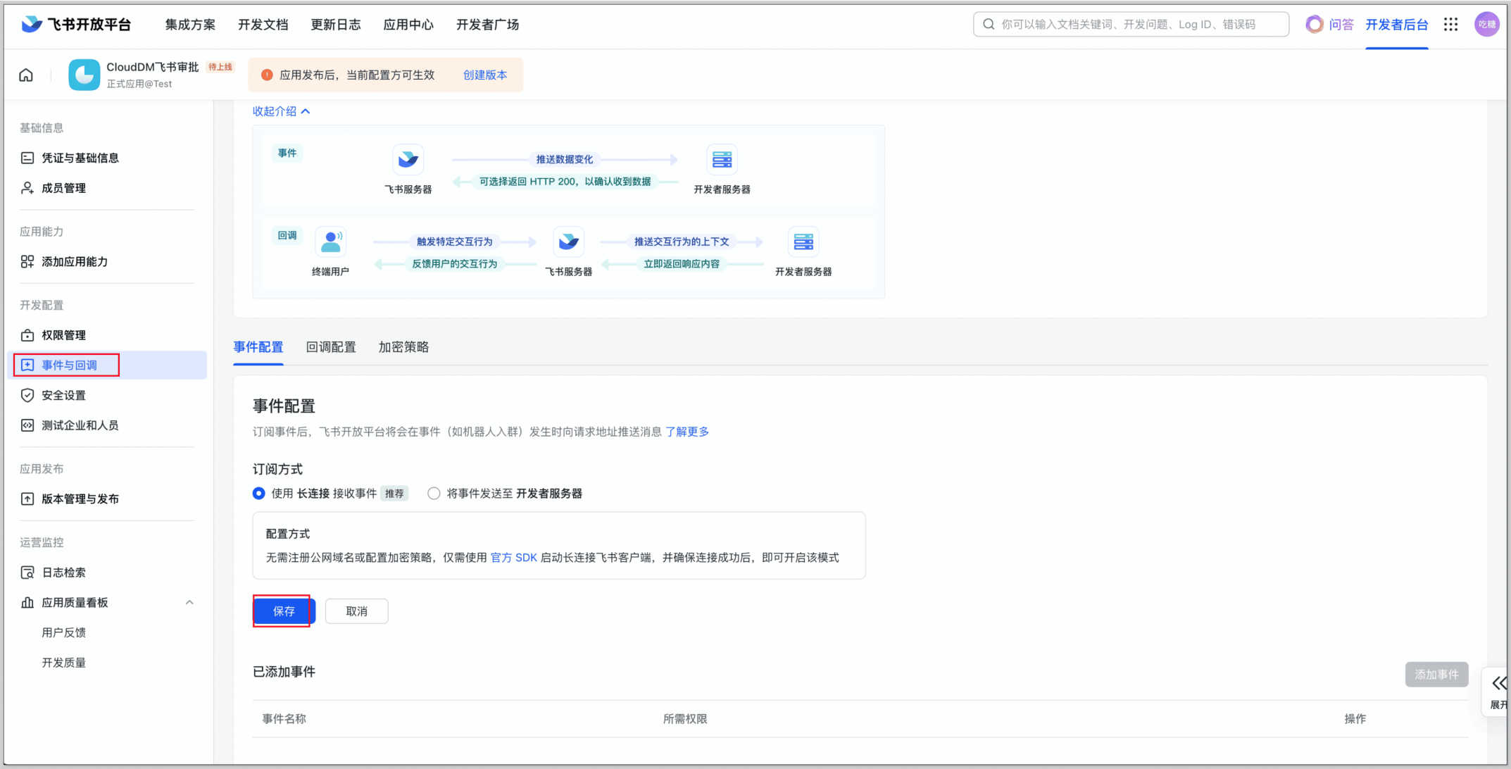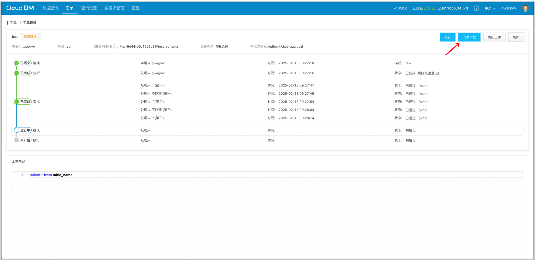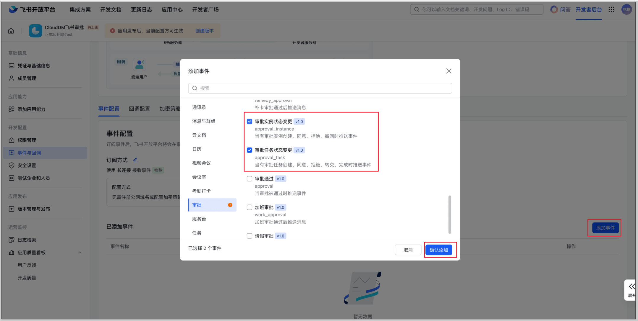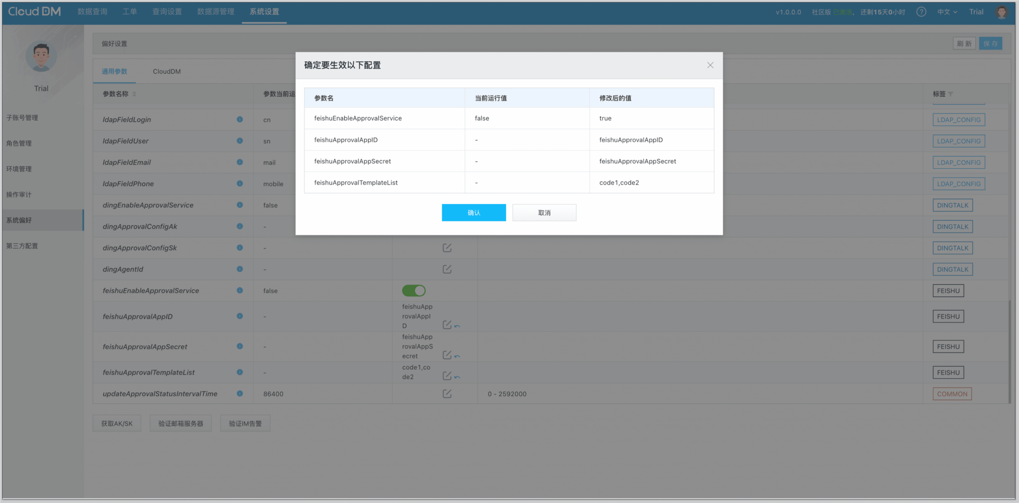 使用 CloudDM 和飞书流程化管理数据库变更审批April 16, 2025 · 4 min read刘琳玉CloudDM 是一个专为团队协同工作打造的数据库数据管控平台。在管控数据库安全变更的过程中,为提高效率,方便用户使用,CloudDM 接入了主流 OA 协同办公系统(包括钉钉、飞书、企业微信),支持实时通知与移动办公,满足广大企业用户的实际需求。 本文将介绍如何使用 CloudDM 和飞书实现高效的数据库变更审批。 接入飞书 创建飞书应用 登录 飞书开发者后台,选择相应的组织,进入后台页面。 点击 创建企业自建应用,填写应用基础信息,并点击 创建。 配置飞书应用