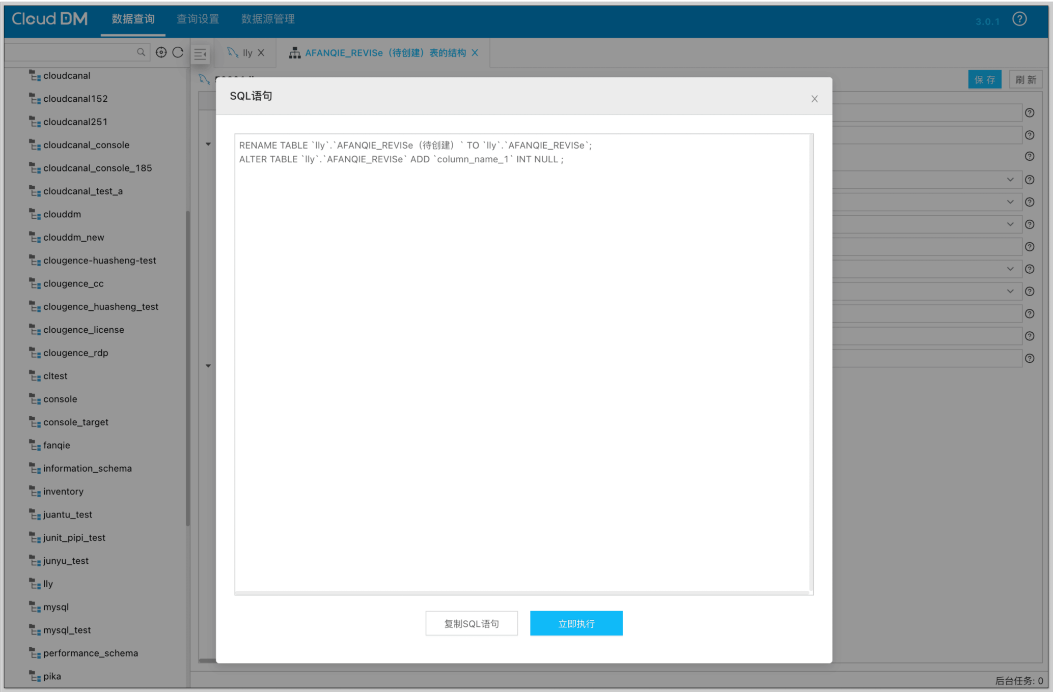 中间的操作和 新建表 类似,修改表信息,然后点击保存 ,对生成的 SQL 点击 立即执行 即可。
