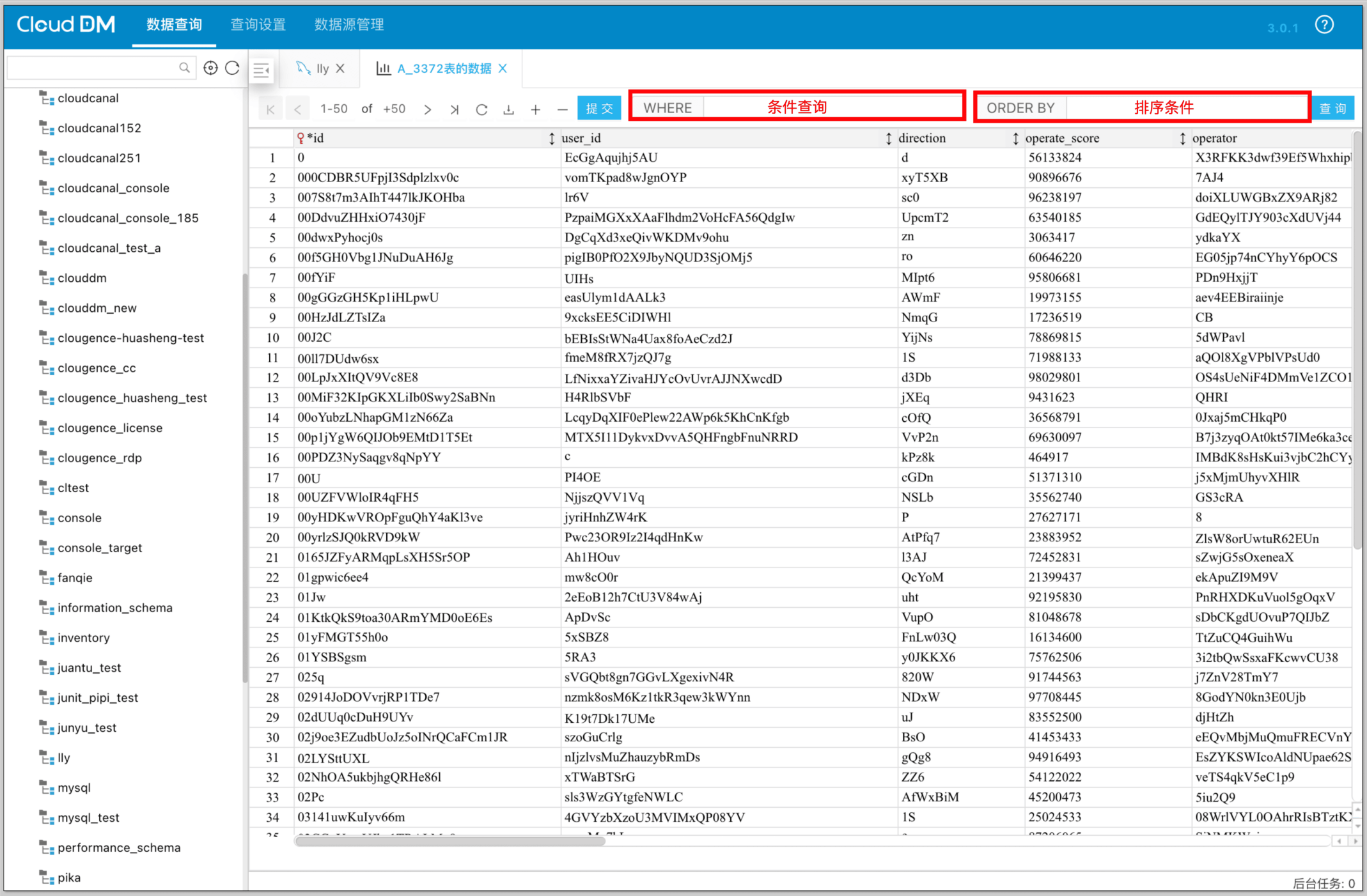 在 CloudDM 中,支持普通的分页查询,还支持拼接 where 条件查询以及排序条件。