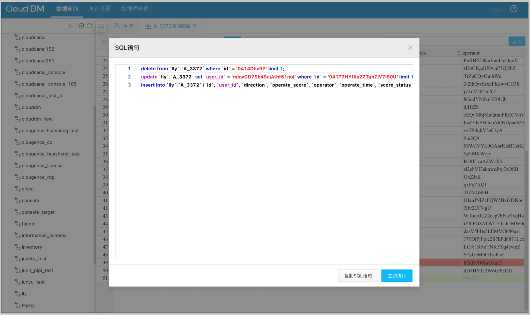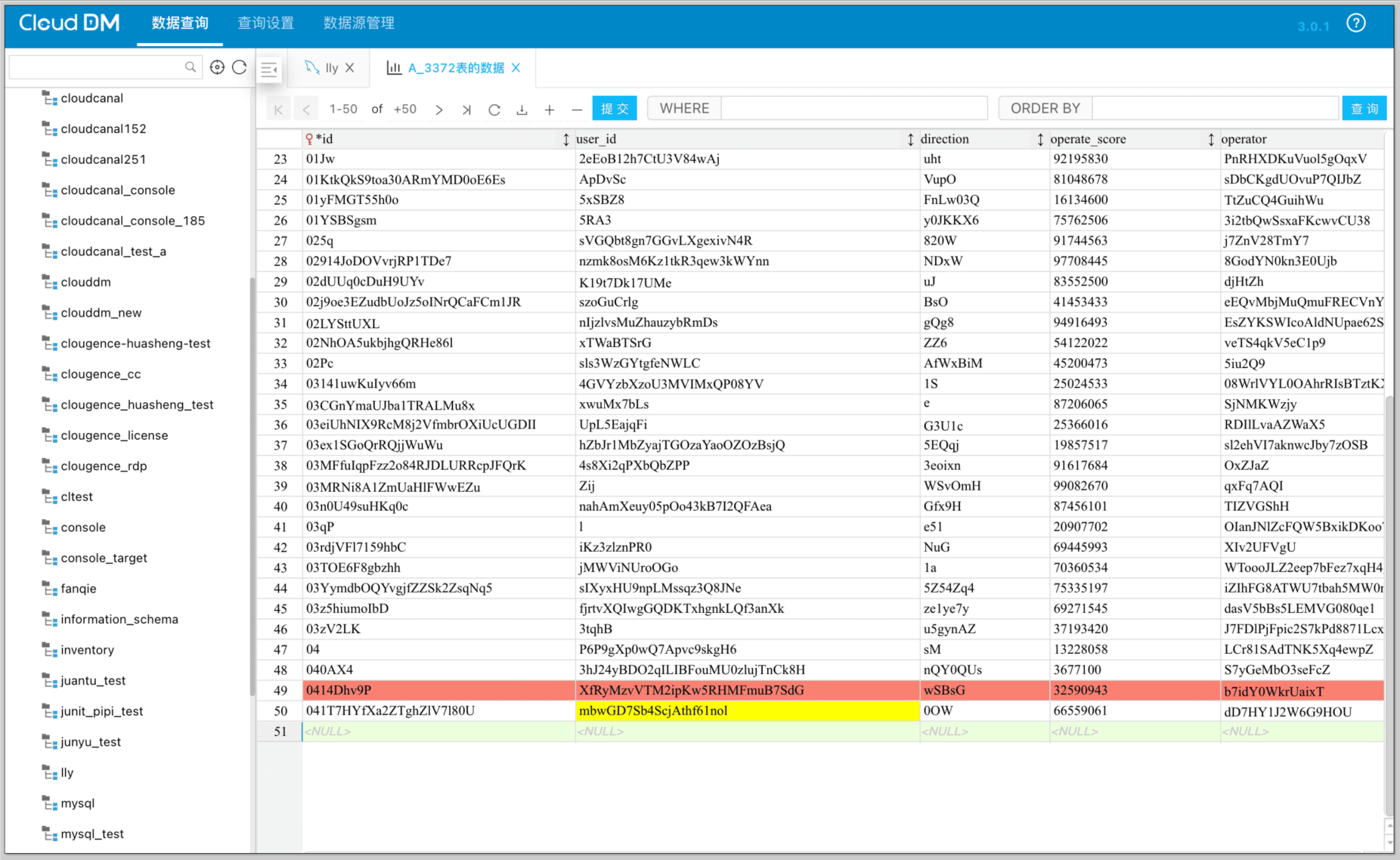 CloudDM 支持编辑表数据,操作包括数据条件查询、插入数据、修改数据、删除数据。