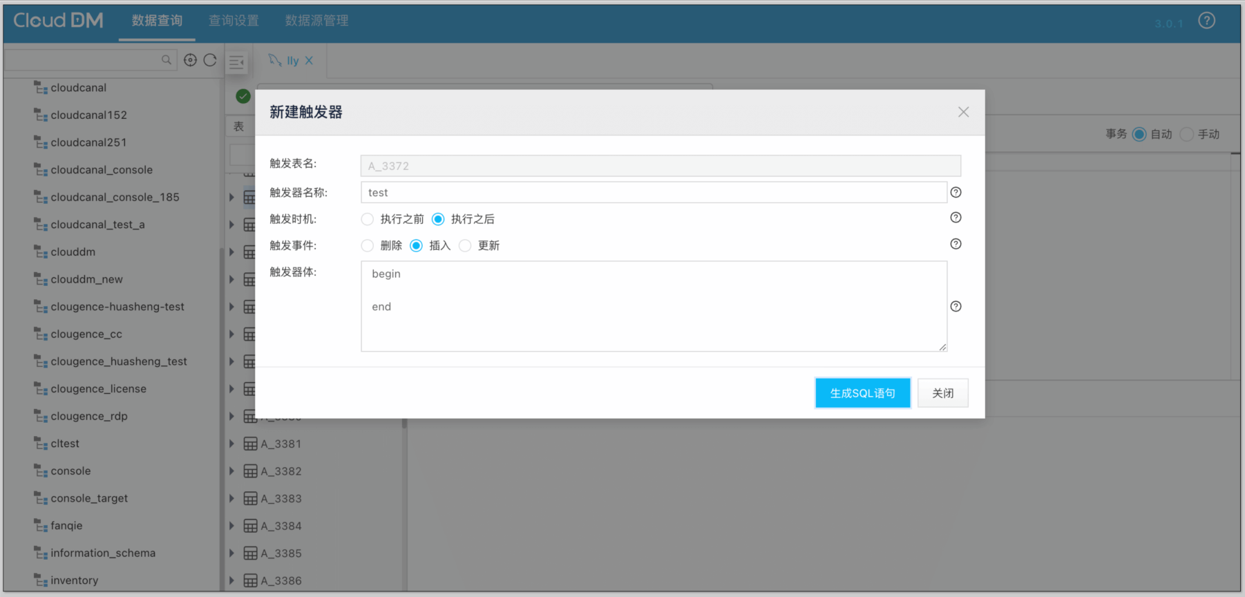 配置完成后,点击 生成 SQL 语句,在 SQL 生成完成后,点击 立即执行,即可创建触发器。