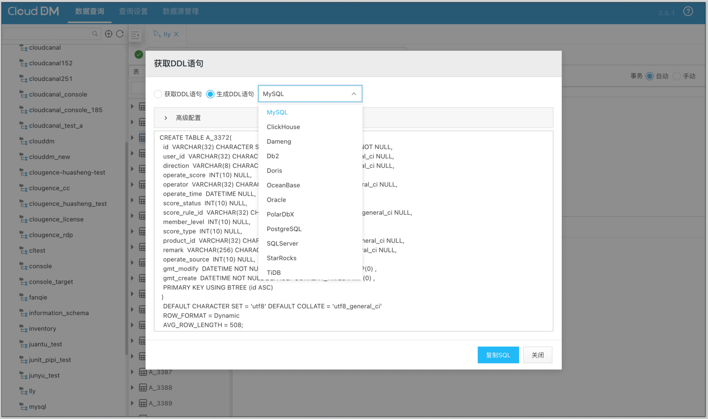 选择 生成 DDL 语句,并选择 对端数据源,便可转化为对应数据源的 DDL 语句。