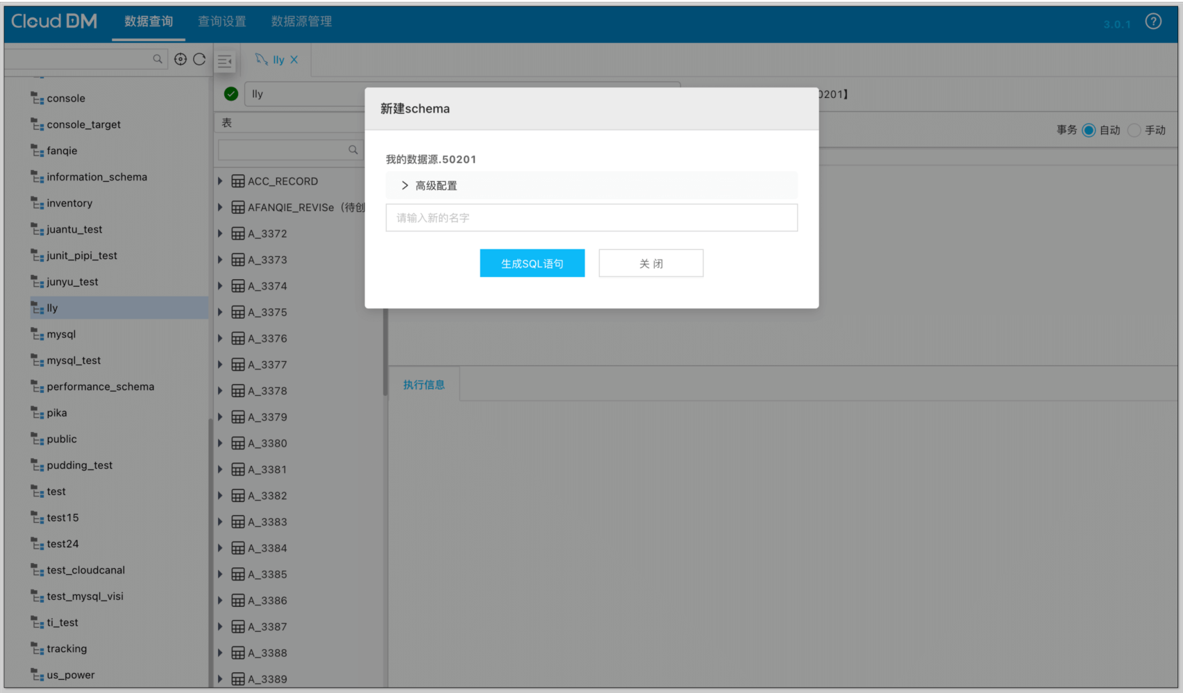 在对话框中填写 Schema 名,点击 生成 SQL 语句 后,点击 立即执行 即可。