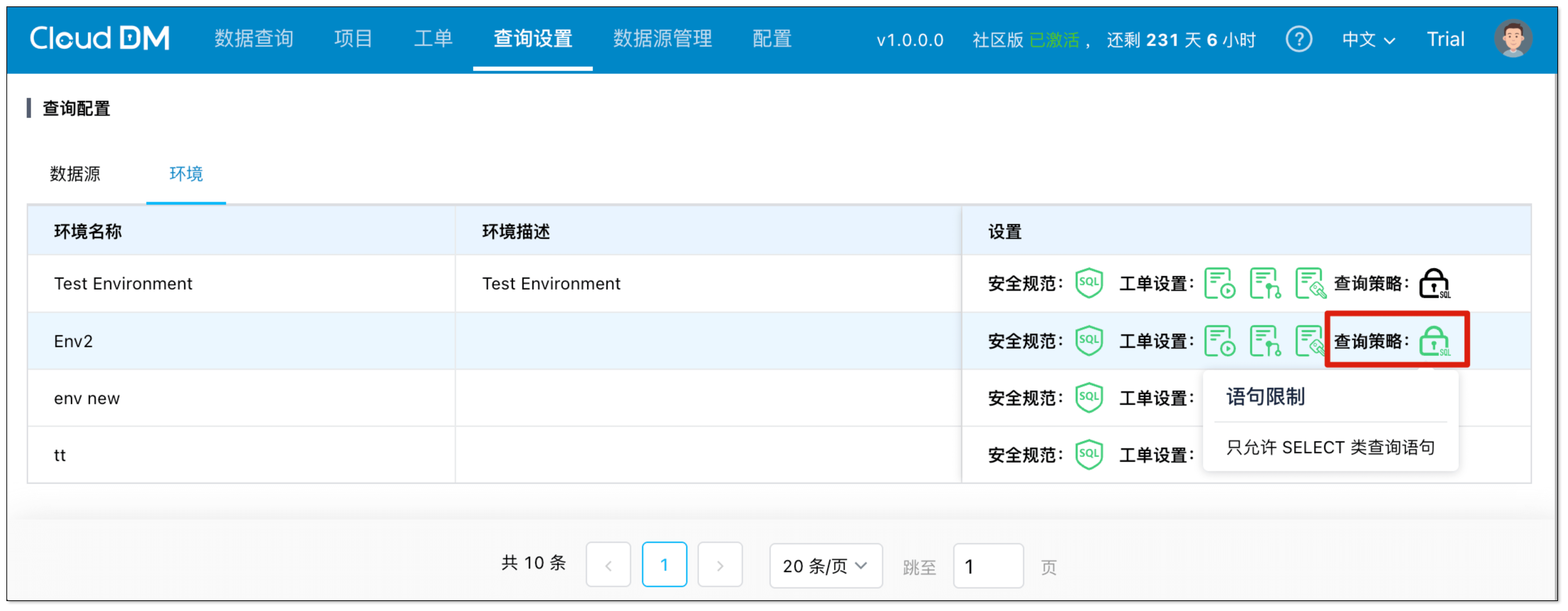 - 支持 查询策略 功能,可配置环境是否只允许执行 查询类 SQL。
